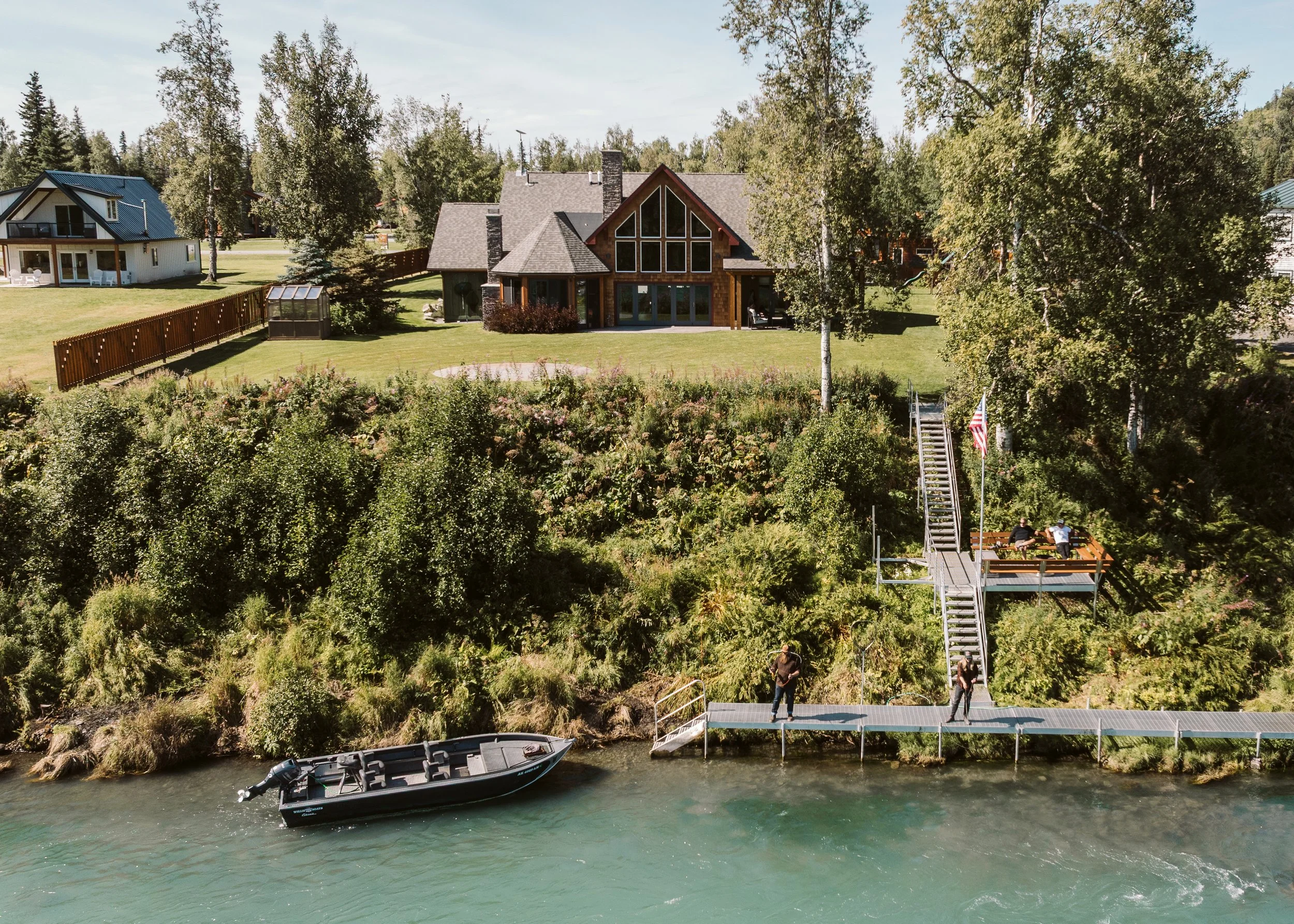 A beautiful and private retreat with vast lawn overlooking the Kenai River! Built with larger groups in mind, this exclusive property is perfect for reunions, retreats, weddings, or other special events. With multiple bedrooms, an open-concept kitchen and dining area, and plenty of outdoor space, it’s a versatile venue. Guests can enjoy quick access to the Kenai River and nearby activities, with the option to book alongside the other two rentals for a true group getaway.